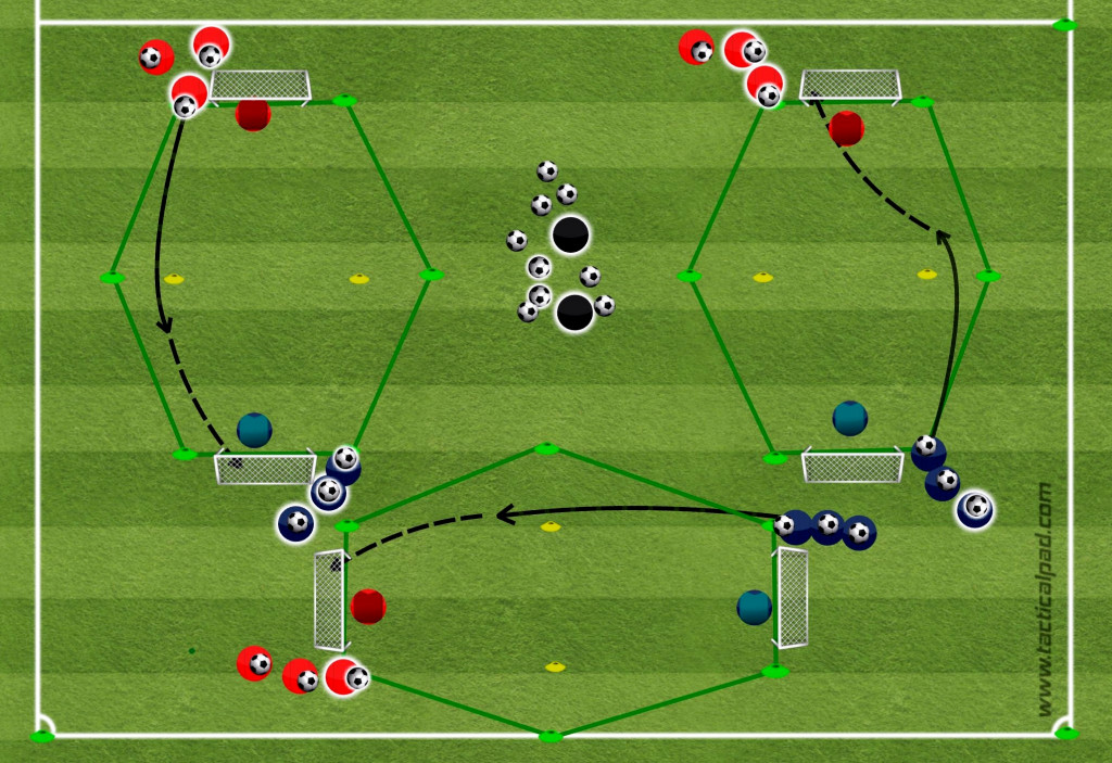 Organisering- Sett opp baner med porter og mål i som vist på illustrasjon, viktig at de er smalere mot mål. - Angriper starter med å føre ball gjennom port på sin side, for så å avslutte på mål. - Når angriper har avsluttet på mål, blir hun/han forsvarer, og skal hindre mål fra angriper på motsatt side Variasjoner Avstand til mål - banestørrelse |